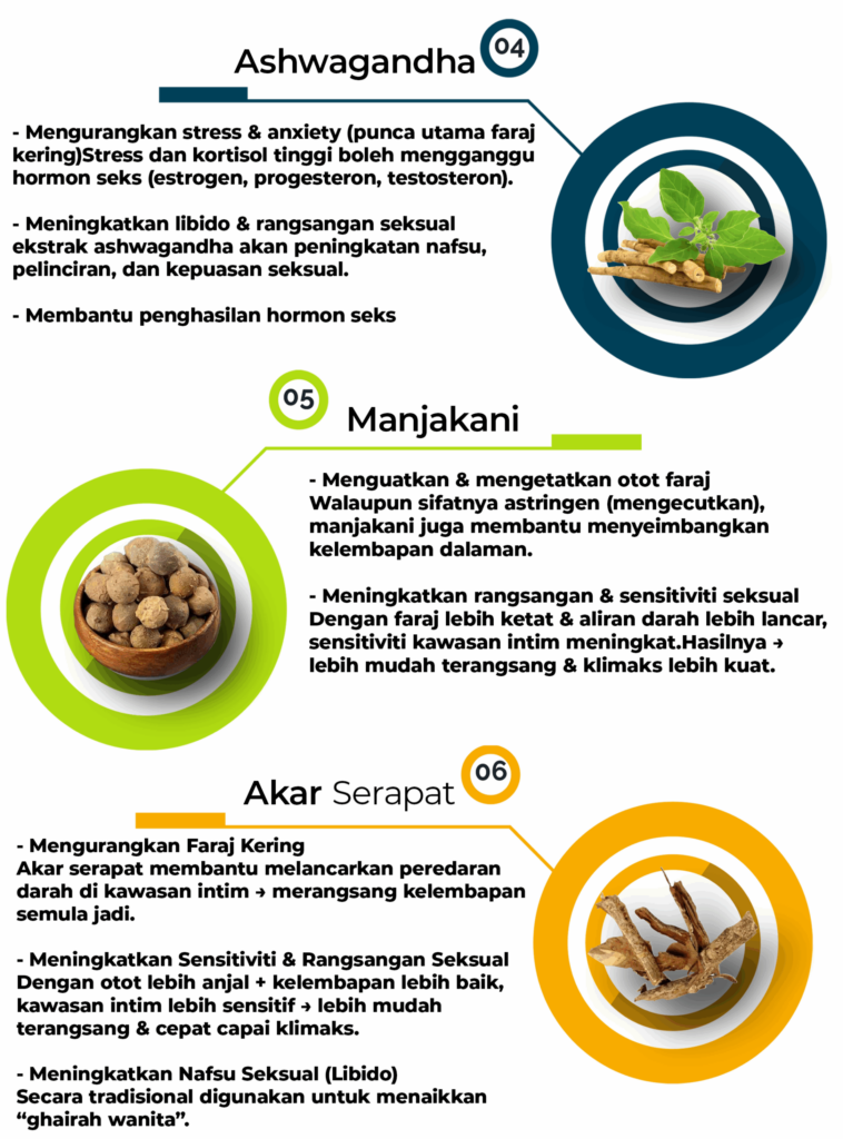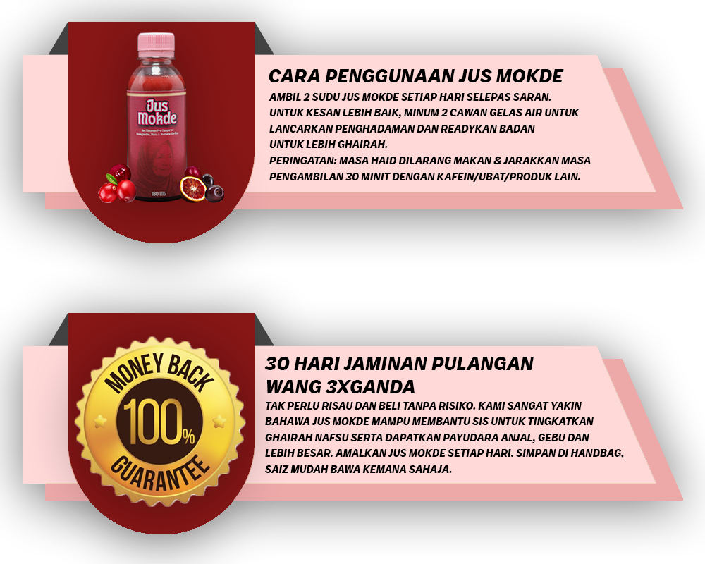 Kandungan hanya 100% bahan semula jadi. Jus Mokde membantu tingkatkan saiz payudara, kesihatan kulit sekitar payudara dan berikan kesan baik untuk kesihatan vagina.