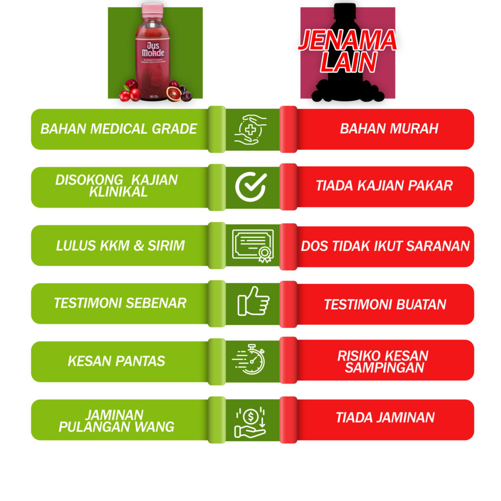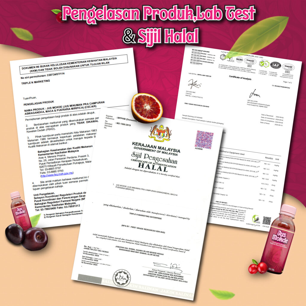 * Jus Mokde tidak mengandungi bahan dadah yang dikawal penggunaannya oleh KKM. Semua bahan di dalam Jus Mokde semulajadi dan selamat digunakan.