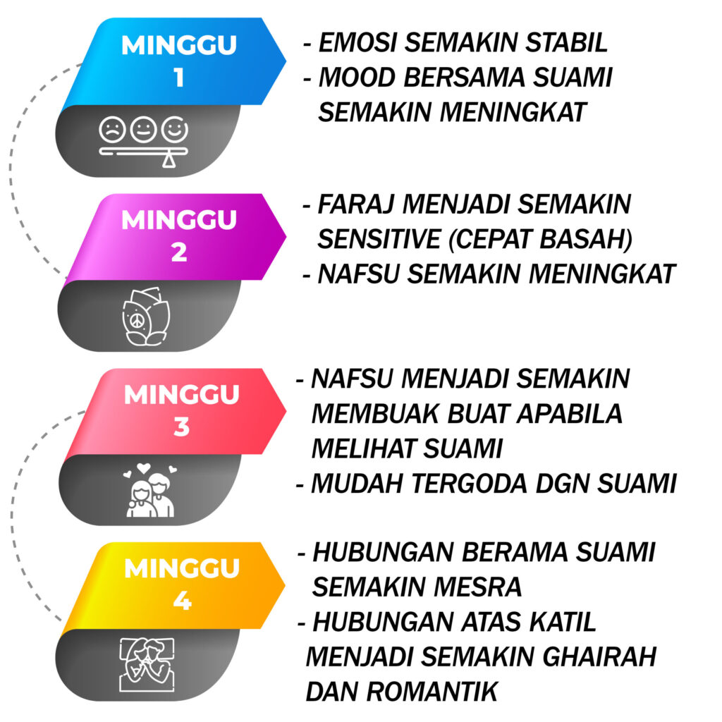 Jadi tak perlu risau, amalkan setiap kali ingin bersama pasangan. Lihat perubahan ketara seawal 7 hari pertama penggunaan. Untuk kesan lebih baik, saiz breast lebih besar, tegang, dapatkan pakej 3 botol untuk penggunaan sehingga 3 bulan.
